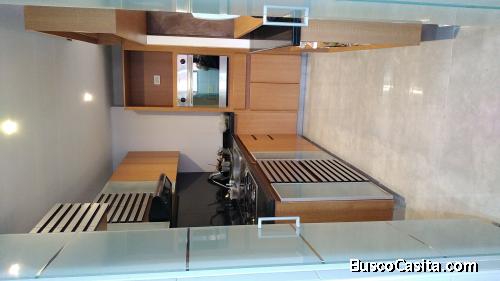 Cuenta con una cocina integral con barra o meson que da a la sala-comedor, con estantes inferiores, la cocina es de piso en porcelanato italiano, cuenta con estufa de cuatro fogones de encendido electrico y gas natural, debajo de esta hay dos cajones extragrandes, hay un mueble esquinero con horno tradicional y espacio para horno microondas, toda la muebleria en madera, con varios cajones, compartimentos y gabinetes, sitio para nevera y acceso al cuarto de limpieza.