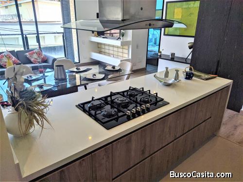 El apartamento presenta un Hall de Ingreso en el cual encontramos una estupenda Cocina semi abierta dotada con mesón y quarztone, estufa de cinco (5) puestos a gas, lavaplatos en acero inoxidable, muebles de despensa, citófono, horno eléctrico, campana extractora y espacios disponibles para nevera y horno microondas. Zona de Ropas de compuerta corrediza, punto de salida de agua para lavadora y mueble de lavadero.